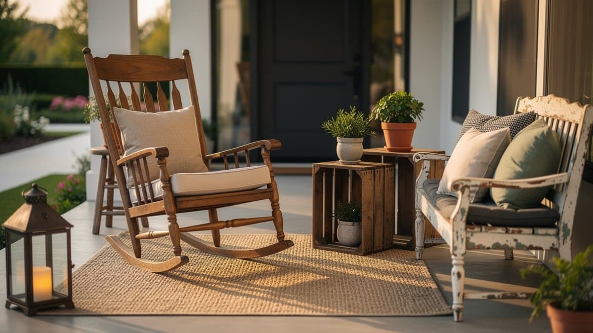 Simple updates like a fresh coat of outdoor paint or new cushions can quickly elevate thrifted front porch decor. Mixing vintage personality with newer accents creates a curated yet cohesive look.